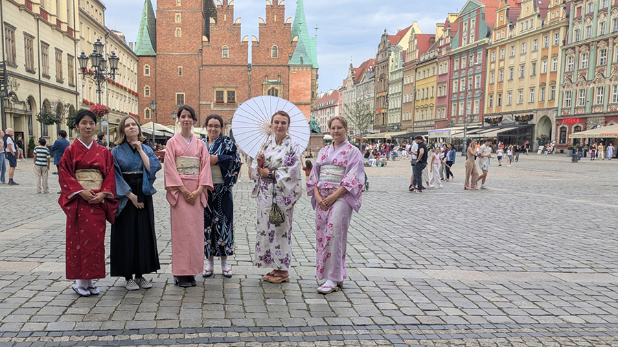 Pogoda dziś była zmienna, ale klub kimonowy 'Nami Oshidori' trafił akurat na słoneczne okienko przed wrocławskim ratuszem i pod fontanną.