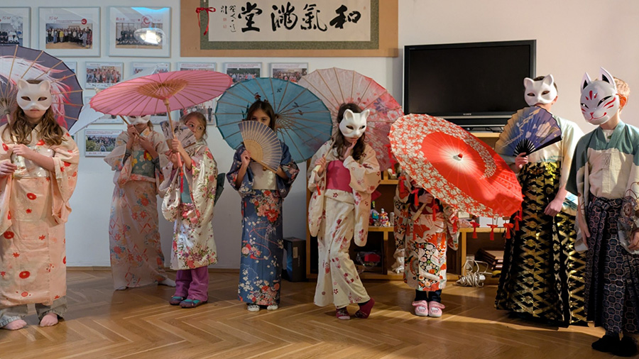 Nie mogliśmy więc pominąć okazji do przebrania uczestników zajęć prowadzonych przez Monikę Pietrasz w japońskie stroje przygotowane i, jak zawsze, sprawnie założone na dzieci przez Alicję Krzywda-Pogorzelską.opis